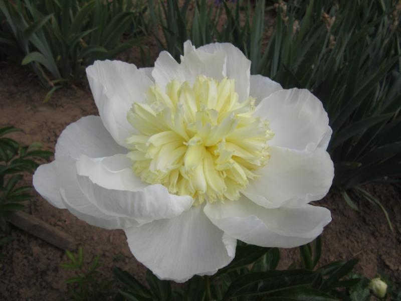 Zusammen mit anderen habe ich diese ohne Namen erhalten. Dieselbe Stiellänge (von Höhe will ich bei der ebenso nicht vorhandenen Standfestigkeit nicht reden), gleiche Blütengröße und denselben roten Fleck wie `Festiva Maxima´, nur eben mit deutlich hellrosa Blüten. Man erkennt den Unterschied erst, wenn die Blüten aufgehen.
