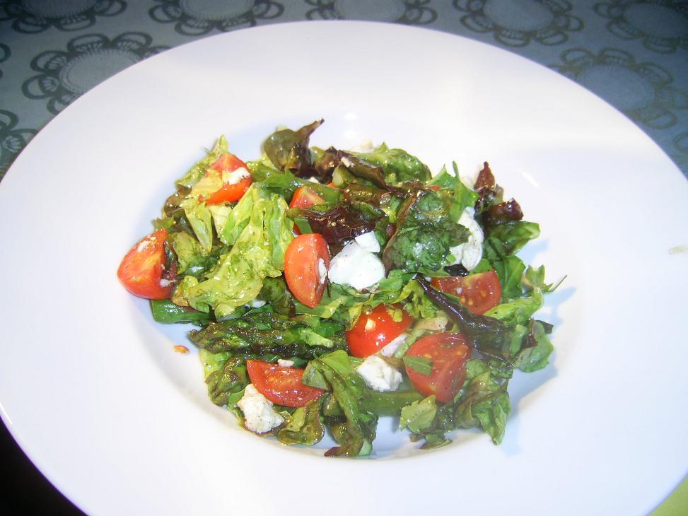 Ich habe heute auch mal wieder Zeit gehabt, in der Küche zu stehen. Es gab frühlingshaften Brotsalat (Altmischbrot, Zwiebel, Paprikaschote, Gurke, bunte Tomaten, angedünstete Möhre und Spargel) mit Essig-Öl-Dressing, serviert auf buntem Gartenpflücksalat, dazu Chicken-Nuggets aus dem Bioladen. Die hatte ich zum ersten - und wahrscheinlich auch zum letzten Mal. Für den stolzen Biopreis waren sie enttäuschend.