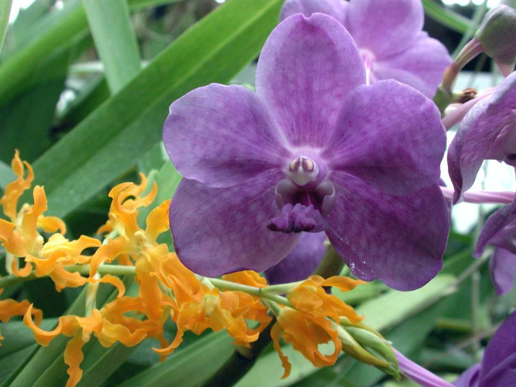 Der durch das Bild laufende Blütenstängel mit den orangefarbenen Blüten gehört übrigens der Hybride Ada aurantiaca x Gomesa crispa. Es ist eine sehr reizvolle Kreuzung, die die kräftige Farbe der Ada mit der hübsch gekräuselten Blütenform der Gomesa (deren Blüten bei allen Arten der Gattung meist weißlich-grün sind) kombiniert.