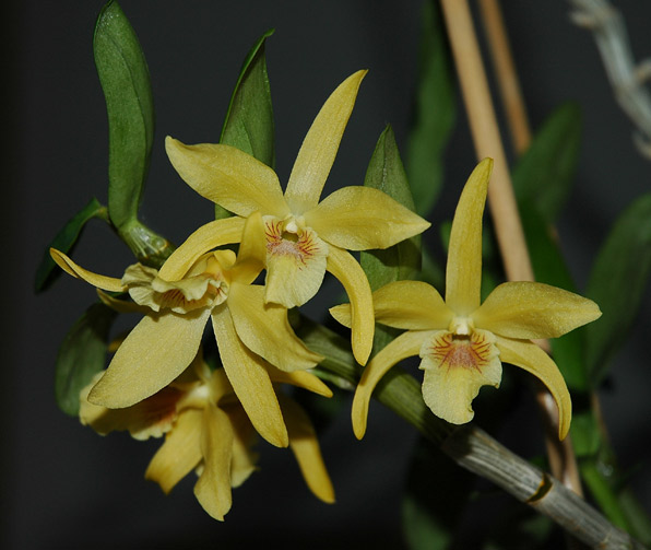 Zu Deinem Erbstück: ich würde es als Dendrobium Stardust, Typ "Chiyomi", einordnen. Es gibt von dieser Hybride auch die mehr ins Orange spielende Fire Bird. Dendrobium Stardust ist Den. unicum x Den. Ukon, wobei letztere Den. moniliforme x Den. Thwaitesiae und diese wiederum Den. Ainsworthii x Den. Wiganiae entspringt. Den. Ainsworthii ist die Kreuzung aus Den. aureum x Den. nobile, während Den. Wiganiae schließlich Den. signatum x Den. nobile entspricht. Wegen des starken Erbanteils von Den. nobile wird Dendrobium Stardust den Nobile-Hybriden zugerechnet und entsprechend gepflegt.