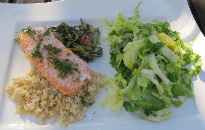 steak vom grill mit dem ersten knackigen romanasalat aus dem garten und kräuterbutterbaguette