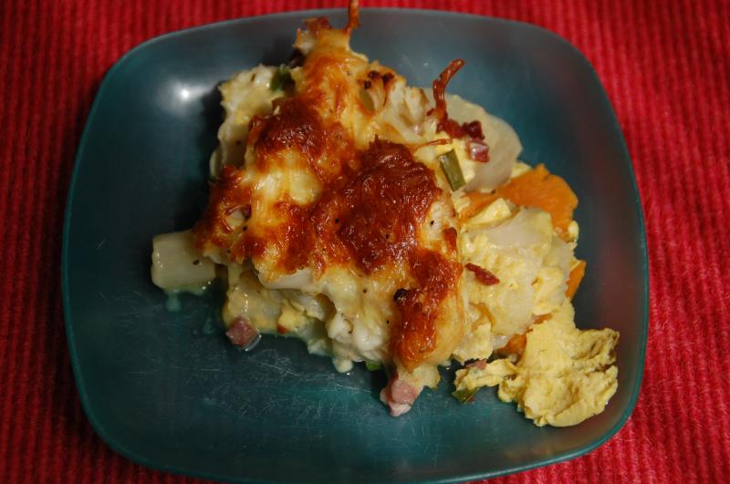 Blumenkohlauflauf (Blumenkohl, Süßkartoffel, Spargel, Topinambur, Schinkenwürfel, Zwiebellauch, Sahne, Ei, Käse)
