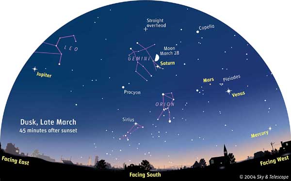 Hallo Simon,Spiegel hat vor ein paar Tagen auf eine ungewöhnliche Konstellation der Planeten Ende März hingewiesen.Angefügt eine Grafik.Venus konnte man heute nachmittag schon gut am südlichen / südöstl. Himmel sehen ...Ist übrigens ne geile Fototechnik, die du da beschreibst.Das Bildergebnis sieht aus wie Saturn oder Jupiter, ich bin (zusammen mit deinen geografischen Angaben) jetzt mal für Jupiter.Leider ist diese Himmelsrichtung von mir aus etwas verbaut, ich schau aber jetzt nochmal genauer nach.AstronomengrüßeThomas