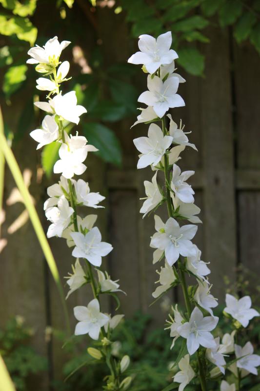 Falls sie Persicifolia-Laub hat: Campanula persicifolia var. sessiliflora (=C. latiloba) `Alba´.Von dieser Glockenblume weiß ich leider icht den korrekten Namen. Sie erhält sich durch Aussaat.