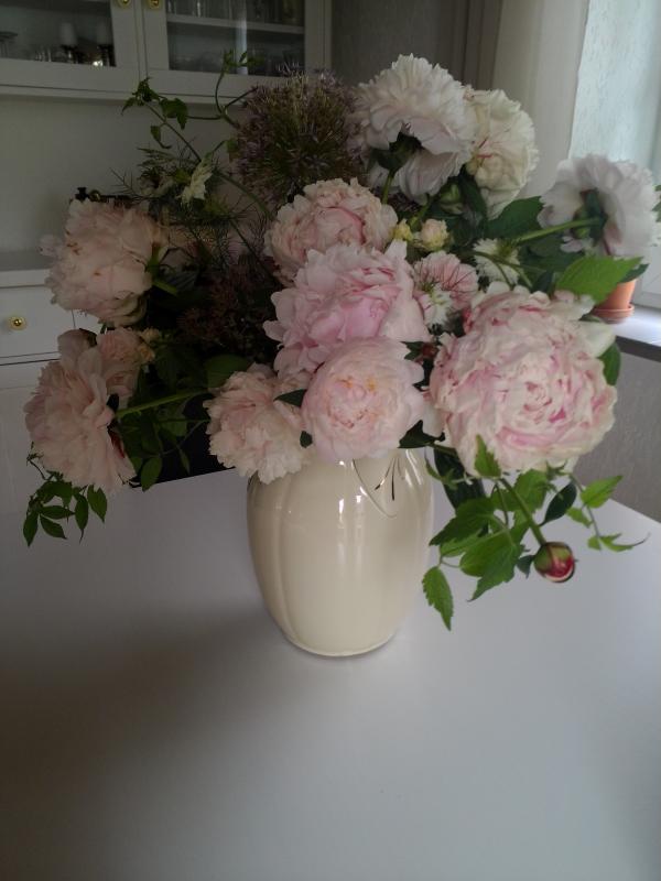 Ich bin wirklich kein regelmäßiger Straußkomponist im Gegensatz zu EmmaCampanula, ich mag die Blumen auch lieber im Garten (und hab davon abgesehen auch nicht soviel Schnittblumentaugliches), aber den halbimprovisierten Muttertagsstrauss (Päonien zugekauft) fand ich recht zufriedenstellend und ich wollt auch nochmal das Bilderhochladen vom Handy testen