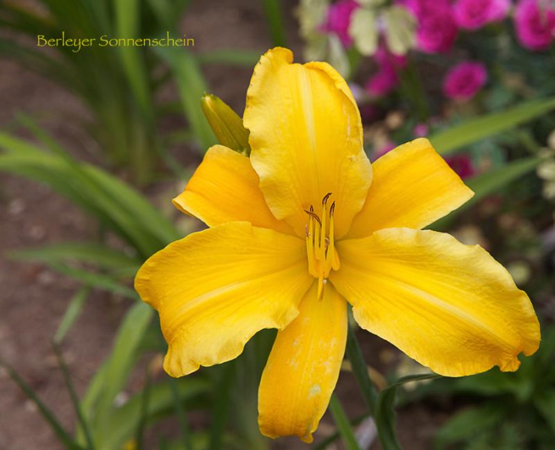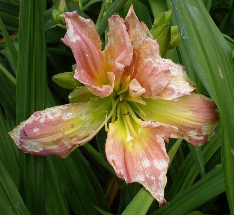 Mein Sämlingsgarten ist staubtrocken. Ich habe heute mal ausgiebig gegossen.Drei Sämlinge waren um 19.00 Uhr noch offen. Dies ist (Piping Rock x Upgrade [angeblich, Sämling aber zu hell dafür] X Regal Afternoon x Dragonfly Dreams), der unter den 30° C hier doch etwas gelitten hat.