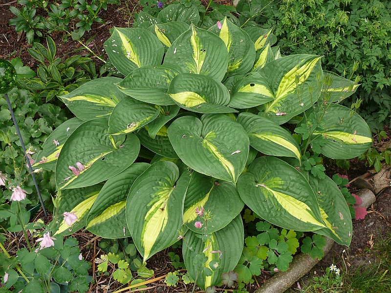 Hosta Lakeside 'Cha Cha' steht trotz lang anhaltenderTrockenheit makellos da. Kein Sonnenbrand und kein Schneckenfraß. Jetzt soll bloß kein Hagelschauer kommen...