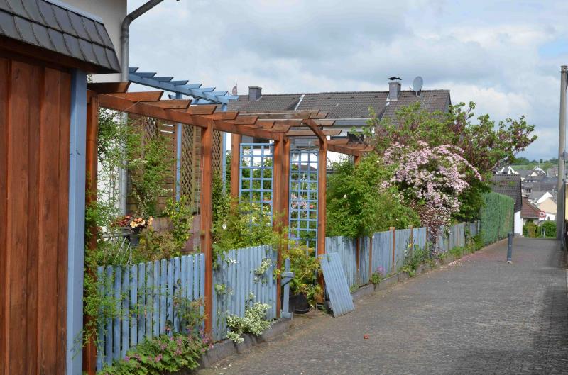 Hier die versprochenen Bilder meiner Guirlande d'Amour. Zwischen der Rosenpergola und den Beeten soll eigentlich ein Pfad bleiben. Das ist bei allen Rosen schwierig, aber mit GdA unmöglich. ;DAls freistehende Strauchros mit viel Platz oder in einer Hecke wäre sie sicher optimal untergebracht. ::)Frontal: Drei Meter schafft meine auch locker - die Pfosten haben knapp 2 m Abstand