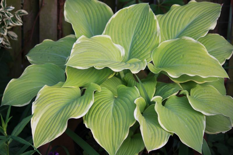 Hosta Lakeside 'Cha Cha' steht trotz lang anhaltenderTrockenheit makellos da. Kein Sonnenbrand und kein Schneckenfraß. Jetzt soll bloß kein Hagelschauer kommen...