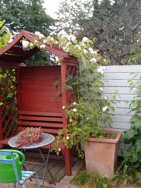 Nahaufnahme'Schön ist Deine Bank. Du könntest auf eine Seite auch eine Clematis hinsetzen, eine viticella. Schau mal beim Westphal rein, da findest Du viele Farben. Die könnte sich dann oben rüberlegen, blüht lange und im Frühling bzw. Winter kannst sie weit runter schneiden. lg elis