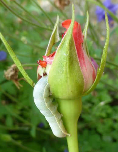 Die Raupe des Kleinen Kohlweißlings hat eine ganze andere Farbe, eher so grün wie der Rosenstängel und die Raupe ist wesentlich kleiner