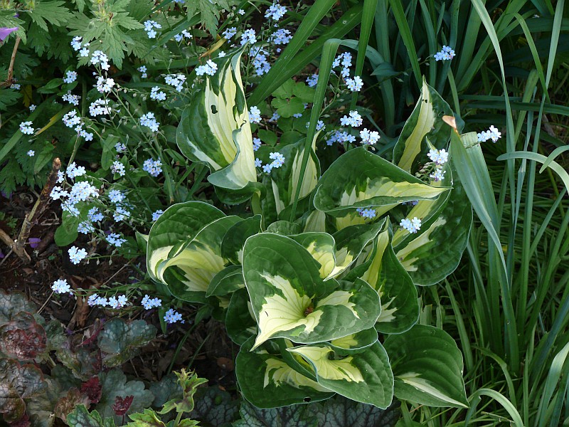 Stand By Me stammt von June ab, das ist richtig.Tom Schmid ist für mich in der Größenklasse eine der schönsten Hostas mit einer ungemein eleganten Ausstrahlung. Die Farbe Blaugrau in Verbindung mit der länglichen Blattform wirkt bei Hostas schon edel - dann noch der vasenförmige Aufbau - und bei Tom Schmid eben noch der weiße Rand, der die Farbe noch unterstreicht. In einer halbdunklen Ecke gepflanzt ist sie einfach unschlagbar. Leider habe ich noch eine weitere Hosta seitlich daneben gepflanzt, die langsam noch größer als Tom Schmid wird. Ausserdem verdeckt ein Acanthus die langen Beine von Tom Schmid - ich muß da mal unbedingt was dran ändern.