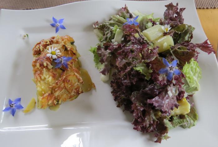Von gestern waren noch einige Stangen Spargel übrig. Die gab es heute zusammen mit dem ersten eigenen Lollo rosso, in einem Dressing aus Schmand, Zitrone, etwas Senf und Bucheckernöl. Dazu gab es Kartoffel-Zucchini-Gratin.