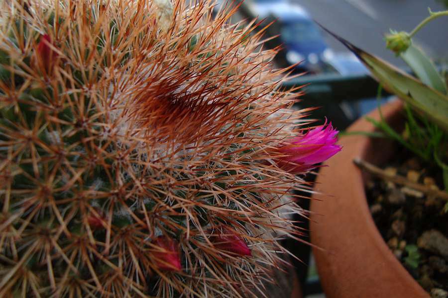 Diese Mammillaria scheint wirklich unkaputtbar zu sein, ein schieres Lebensfreude-Blüh-Foto.Weißt du, welchen Opuntien-Leuchter du da hast?
