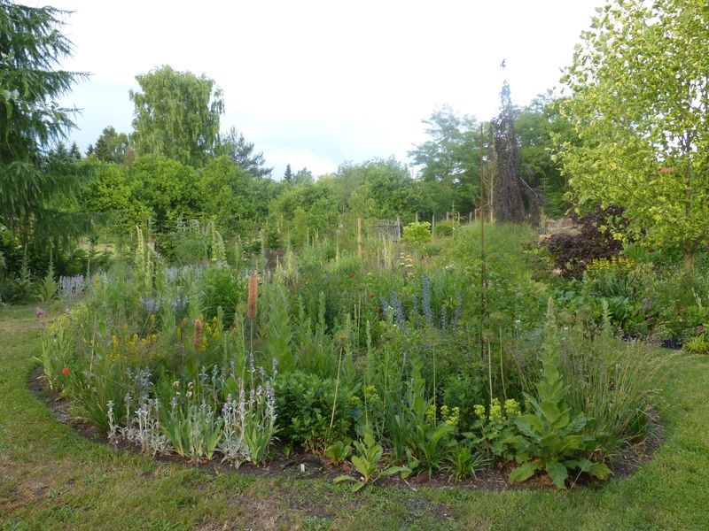 Ach iwo, das muss und kann ja nun nicht jedem gefallen. ;)Die Gräser werden noch die Hauptrolle übernehmen, aber das ist diesbezüglich nunmal eher ein klassisches Herbstbeet. Dann übernehmen die Miscanthus und die Astern. Bis dahin wäre es ohne Blüten doch ein wenig langweilig und so durfte es kräftig blackboxen. Zugegeben, die Mengen an Verbascum mischen das Bild dieses Jahr ziemlich auf. Die übrige Bepflanzung wäre derzeit noch deutlich zurückhaltender. Den Kontrast dazu liefern die Natternköpfe. In acht Wochen wird das schon ganz anders aussehen.