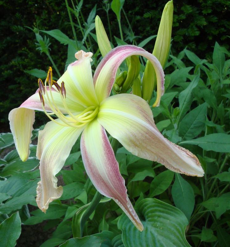 Wächst noch. Sie gehört nicht zu den besonders hohen, wird aber so um die 70 - 80 cm hoch.Hier steht sie nicht ganz hinten, auch weil die Blüten recht groß sind und aufgrund ihrer Form nicht "über allem schweben". Ich fand, dass der Blick auf diese Sorte relativ frei sein sollte.