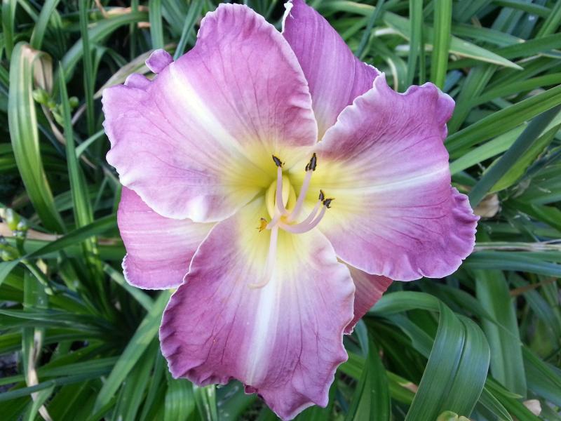 Krokosmian, ich hätte anhand deines Fotos auch an Schneckenfraß gedacht. Versuch doch mal, eine charakteristische Stelle mit dem Zoom zu vergrößern. Jedenfalls sieht es nicht dramatisch aus. Du kannst ja das Laub kräftig zurückschneiden, wenn du sie einpflanzt oder umtopfst.Mein Highlight heute in überirdischem sauberen Violet: Mavis Gift X America the Beautiful x Ashwood Smokey Joe.