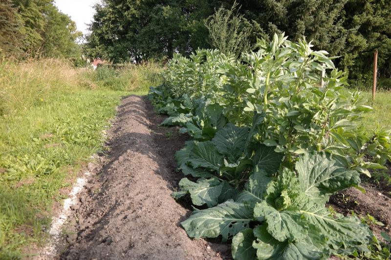 Und hier noch mal ein Foto von mir:Es startete als Projekt eines Vereins, ist gepachtetes Gemeindeland und wurde schon nach 1945 als Gemüsegarten genutzt. Hier bekamen die Umsiedler, die bei verschiedenen Bauern wohnten, jeweils eine kleine Parzelle um sich ein wenig selbst zu versorgen. Ca.20m ist ein kleiner Bach, der früher oft zu Überschwemmung neigte, es ist zwar weitestgehend Sandboden aber doch auch sehr fruchtbar. Leider ist das Projekt etwas eingeschlafen, so kümmere ich mich nun allein darum. Hier wachsen dieses Jahr Möhren (sehr gut), Puffbohnen, Wirsing und 2 Dämme hab ich noch mal mit späten Möhren eingesät.