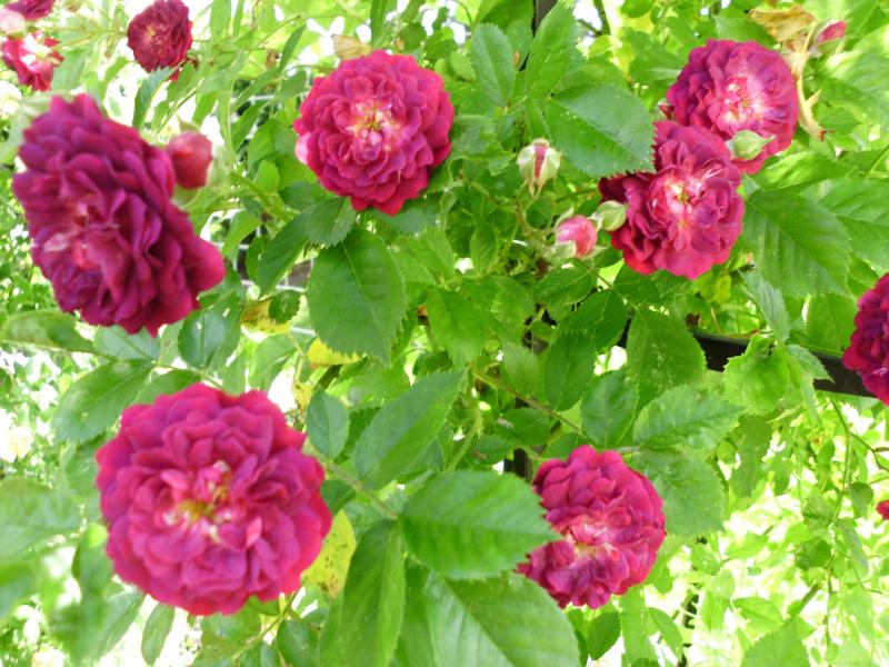 Bleu Magenta blüht tief lilarot, ich habe noch ein Foto gefunden, da wird sie aber von meiner Kamera heller dargestellt, weil es damals ziemlich sonnig war. Wie gesagt, sie ist ansonsten dunkler, nur im 1. Jahr blühte sie sehr pink. Da hatte ich mich schon sehr erschrocken, habe dann aber gelesen, dass sie mit jedem Standjahr dunkler wird, was auch stimmte. Siehe oben, das Bild stellt sie sehr farbgetreu dar.Noch etwas, die Dornen halten sich in Grenzen!