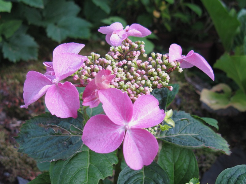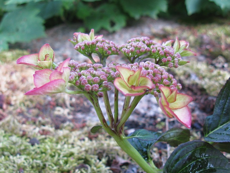 Ziemlich überraschend blühte letzte Woche der erste Hydrangea-Sämling überhaupt und da ich ihn recht hübsch finde, habe ich ihn aus seinem selbst gewählten Bett zwischen Waschbetonplatten und Kieseln rausgepfriemelt und erst mal in einem Topf geparkt. Mal sehen wie er sich weiter entwickelt, er scheint wüchsig zu sein. In der Nähe stehen Hydrangea serrata 'Tiara' und H. serrata 'Preziosa' (und H. paniculata 'Kyushu, aber die dürfte wohl nicht beteiligt gewesen sein).