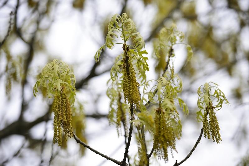 Die häufigste Eiche dort ist Quercus velutina, die mit dem Austrieb blüht.