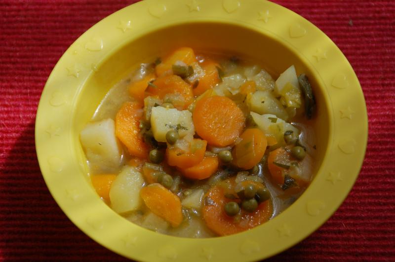 Möhreneintopf (Möhre, Zwiebel, Kartoffel, Porree, Liebstöckl, Salzpetersilie, Erbsen, Gemüsebrühe).