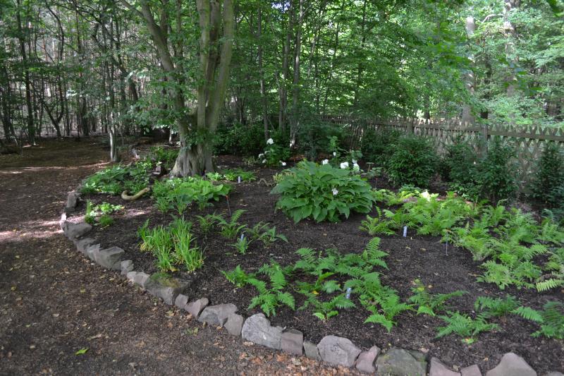 Die im Beet gesetzten Farne und Hostas haben sich toll entwickelt - insbesondere die später noch gesetzten Polystichium setiferum.
