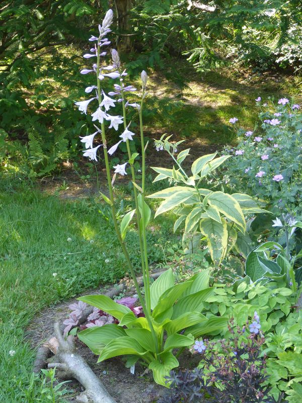 Die Höhe beträgt knapp 40 cm ab Oberkante Topf. Ein zweites Exemplar im Beet wird deutlich höher, sicher um die 50 cm, biene. Bei Marco habe ich jetzt 2 Fotos der 'Early Times' gefunden, auf denen ich eine frappierende Ähnlichkeit erkenne. Ein Sport von June würde auch evtl. auf die gute Sonnenverträglichkeit hinweisen. Zunächst herzlichen Dank für Deine schnelle und professionelle Einschätzung, biene! (Gestern war Besuch da und ein Ableger wurde ausgebuddelt. Es ist immer schade, wenn man keinen Namen dazu parat hat) Blüht sie bei Dir schon? Hier noch eine andere Perspektive aus dem gelben Beet unter dem Kirschbaum (mit 'Lakeside Cha Cha'):