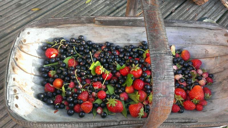 Ein paar Kartoffeln für den Sofortverzehr, ein paar Radieschen, die auch schon vertilgt sind, Zuckererbsen, letzte Erdbeeren und erstmals schwarze Johannisbeeren von Bienchens Spende.