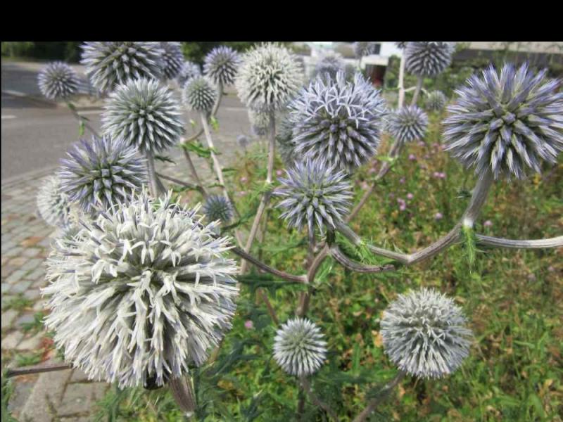 Diese Kugeldistel blackboxt in einer Verkehrsinsel, an der ich fast täglich vorbeifahre, sie wurde wohl dort angesät. Ist es nun E. sphaerocephalus (ich kenne von ihr nur die Sorte `Arctic Glow´) oder E. exaltatus? Ich wollte keine Ganzkörperaufnahme machen, wegen Persönlichkeitsschutz und so.