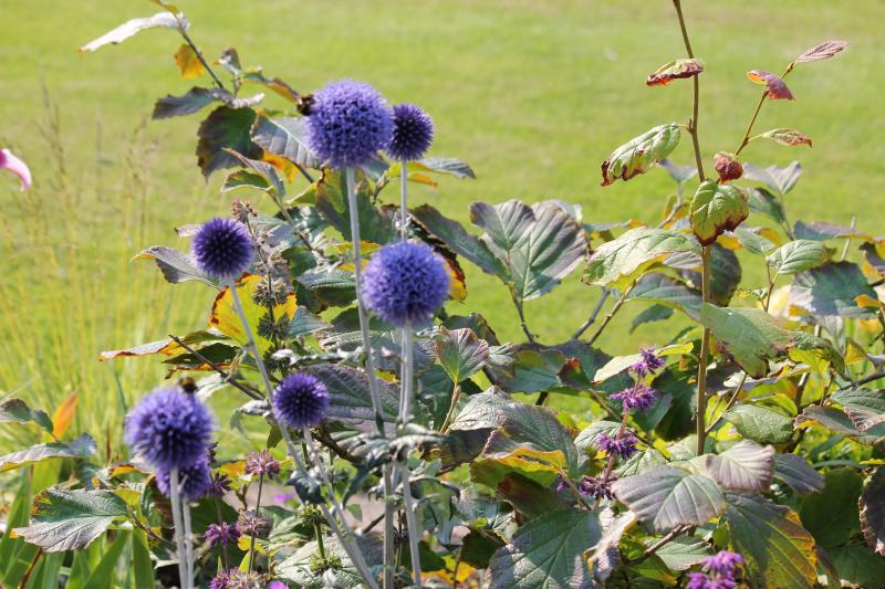 inzwischen habe ich drei verschiedene Formen von Echinops im Garten. Gepflanzt hatte ich natürlich Echinops ritro 'Veitch's Blue' und Echinops banaticus 'Taplow Blue'. Letztere nicht zu unterscheiden von der ersteren. Dann habe ich vor Jahren Echinacea tennesseensis [GdS Samentausch] ausgesät und raus kam Echinops und ein Exemplar blühte weiß, also Echinops sphaerocephalus, und ...ein Exemplar blühte sehr tief blau, dieses hier.