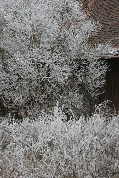 Weiherlandschaft mit Rauhreif 9Selbst so ein ungehobelteter Schuppen erhält zum Schmuck eine Spitzengardine.