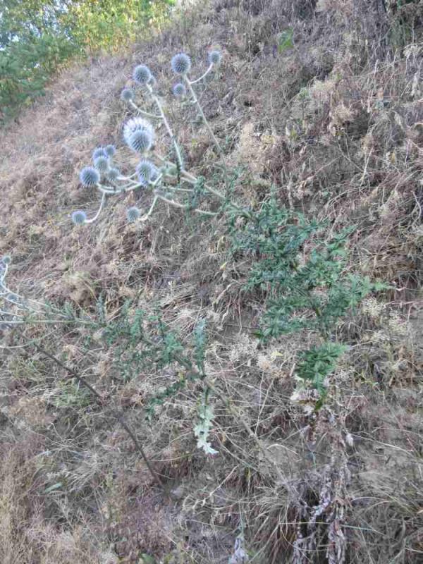Die Blüte ist dann doch eher weißlich mit blauem Schimmer. Diese Pflanze, die einzige von mehreren die sich halbwegs gefahrlos fotografieren lässt, wächst aus einer fast senkrechten Straßenböschung. Auffällig finde ich, dass sonst jegliche Pflanze in der Umgebung verdorrt ist, es sieht etwas surreal aus. Vermutlich erreicht die Kugeldistel tiefere liegenden Unterboden, sie wächst in etwas über einem halben Meter "Höhe".Die Art zu bestimmen überfordert mich, ich entdecke Anzeichen von E. sphaerocephalus und von E. exaltatus, vielleicht fällt es jemand Anderem leichter? Wenn nicht dreht die Welt sich trotzdem weiterIch habe heute an einer der Hauptzufahrtsstraßen nach Stuttgart direkt hinter der Leitplanke graublaue Echinops entdeckt,
