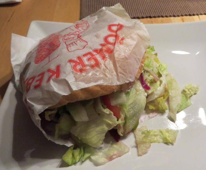 Nachdem der liebste gestern mit rund 2,5 h Verspätung aus Freising kam, war es zu spät, um noch zum Italiener zu gehen. Deshalb gab es aus dem Bahnhof mitgebrachte vegetarische Dönertasche mit Schafskäse