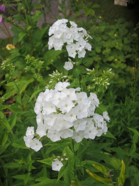 Als erste Phloxe blühen im Sandgarten ein namenloser reinweißer (ca 140 hoch), Blauer Morgen (weniger blau als im Lehmgarten) und Oljenka