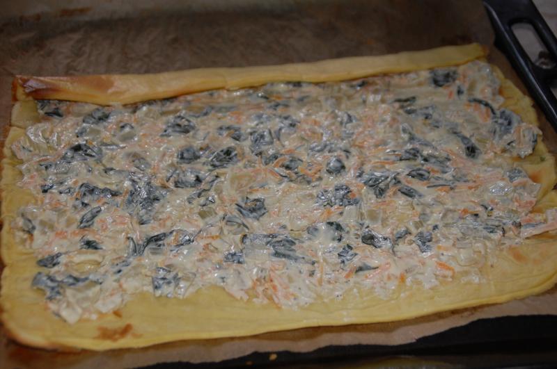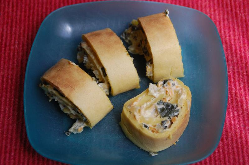 .Heute Mittag gab es gefüllte Eierkuchen. Einfachste Zubereitung: Eierkuchenpampe auf backpapierbelegtes Blech gießen und 15 Minuten backen, in ein Tuch bis zur weiteren Verarbeitung einrollen. Die Füllung bestand diesmal aus Pak choi, Zwiebel, geraspelte Möhre und Frischkäse. Wieder aufrollen und noch einmal kräftig backen.
