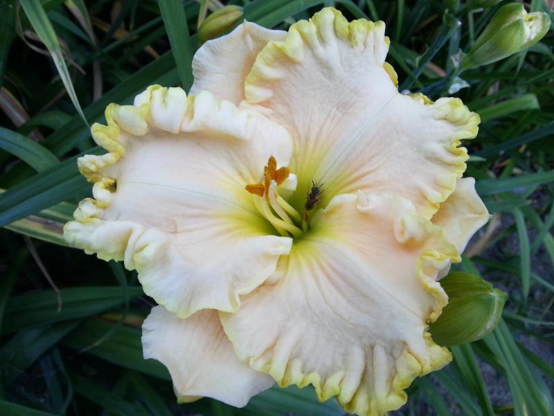 Aber wenigstens sehr schöne Vasenblume, enaira. Außerdem ist doch noch einer da.Als Kontrast eine fast Weiße (Boundless Beauty x Fringy). Die kleine Wildbiene im Kelch bittet um wohlwollende Beachtung.