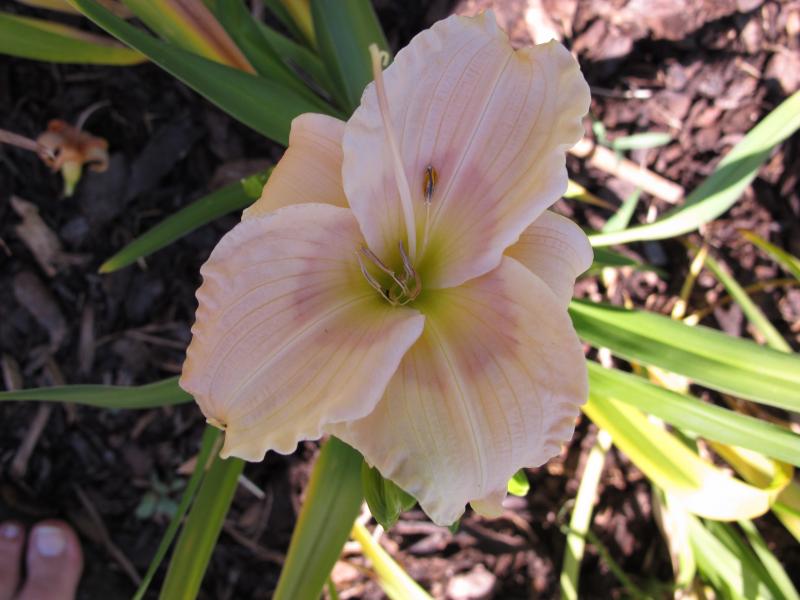 Die Blüte, die ich an Teilstück im Zweitgarten (Verwechslung ausgeschlossen) vorgestern fotografiert habe, sah übrigens so aus. ::)Es wurde schonmal von hymenocallis-hemerocallis festgestellt, die die Sorte bei Hitze nicht überzeugt...