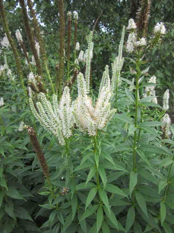 Zwei Monate später sind in diesem Sämlingsbestand noch nicht alle Pflanzen vollständig aufgeblüht, man sieht es im Hintergrund. Es gibt nach der langen Sommerdürre keine wirklichen Trockenschäden, die leichte Blessur im Vordergrund des Bildes unten ist fast die einzige. Zwar wachsen seit letztem Jahr im Garten zwei Pflanzen, die Gattung habe ich bisher aber nicht wirklich so richtig beachtet. Wenn ich aber diesen Bestand anschaue, der im Wurzelfilz der Birke diesen eigentlich katastrophalen Sommer nahezu schadlos überstanden hat, dann muss ich mir eingestehen, dass das Zeug wirklich was kann! Auch dann wenn man einrechnet, dass Birke und Veronicastrum wahrscheinlich gemeinsam groß geworden sind. Beeindruckend finde ich auch die Bandbreite der Blütezeiten, ebenso die die teilweise unterschiedlichste Ausprägung der Kandelaber, eigentlich dürfte schon diese Sämlinge (ca. fünfzig Stück) Grundlage für mehrere Sorten sein. Und wenn man dann noch die Lila-/Blautöne mit einbringt.... Apropos, kann es eigentlich sein, dass die farbigen Sorten zumindest teilweise auf Einkreuzungen von Veronicastrum sibiricum beruhen? Kürzlich sah ich eine entsprechend ausgezeichnete, wohl echte Pflanze, deren Laub mich an das von `Fascination´ erinnerte, welche auch wie die Art relativ früh blüht. Meine V. virginicum `Album´ blüht dagegen später, ihr Laub und die Blütenfarbe sehen eher wie diese Sämlinge aus.Hier in der Nähe steht seit gut 15 Jahren ein Bestand, einer der letzten Reste einer einst ambtionierten Staudenpflanzung, welche aber größtenteils der Mangelpflege, der Zeit und dem Februarkahlfrost 2012 zum Opfer gefallen ist. Es handelt sich wohl um Sämlinge, eventuell auch um das, was so als normale Art V. virginicum in Kultur ist. Die Blüten sind fast alle weiß, gelegentlich mit etwas Lilastich. Unterschiede sind in Höhe und Blütezeit auszumachen, das Bild zeigt die bisher einzige blühende Pflanze. Sie werden allmählich von einer größer werdenen Birke be-, aber offensichtlich nicht verdrängt. Ebensowenig zeigen sie irgendwelche Trockenschäden, die Pflanzen stehen da wie das blühende Leben , bei der momentanen Hitze eine echte Wohltat fürs Auge! Sie kommen, wie schon mehrfach beschrieben, zumindest eingewachsen offenbar sehr gut mit Trockenheit zurecht. Und ich finde auch den Winteraspekt nicht zu verachten.