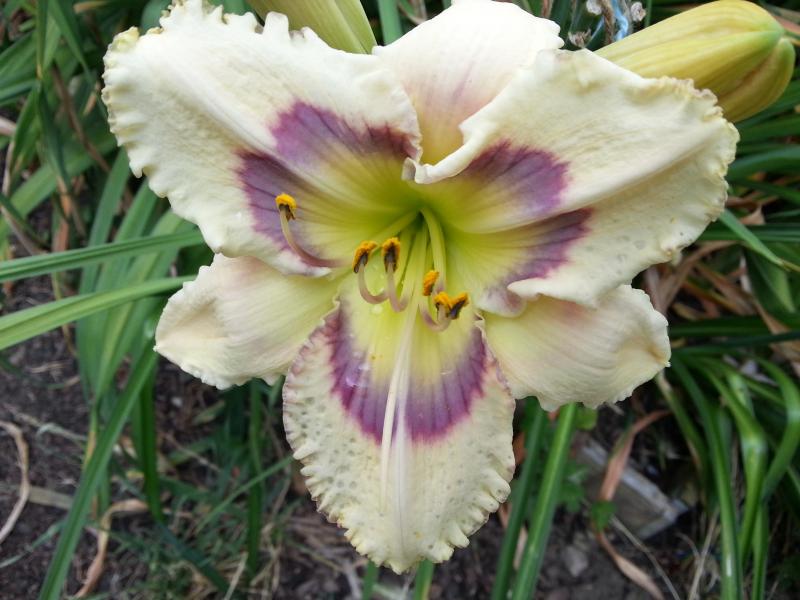 Letzte Blüte eines zwar nicht blauen, aber wunderschönen zartrotäugigen Sämlings aus der Kreuzung Footprints in the Sand x Dragonfly Dawn. Entschuldigt bitte den Regen- und Sturmschmutz und meine Hosenbeine, die sich ständig in meine Fotos drängen.