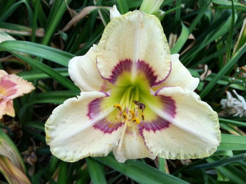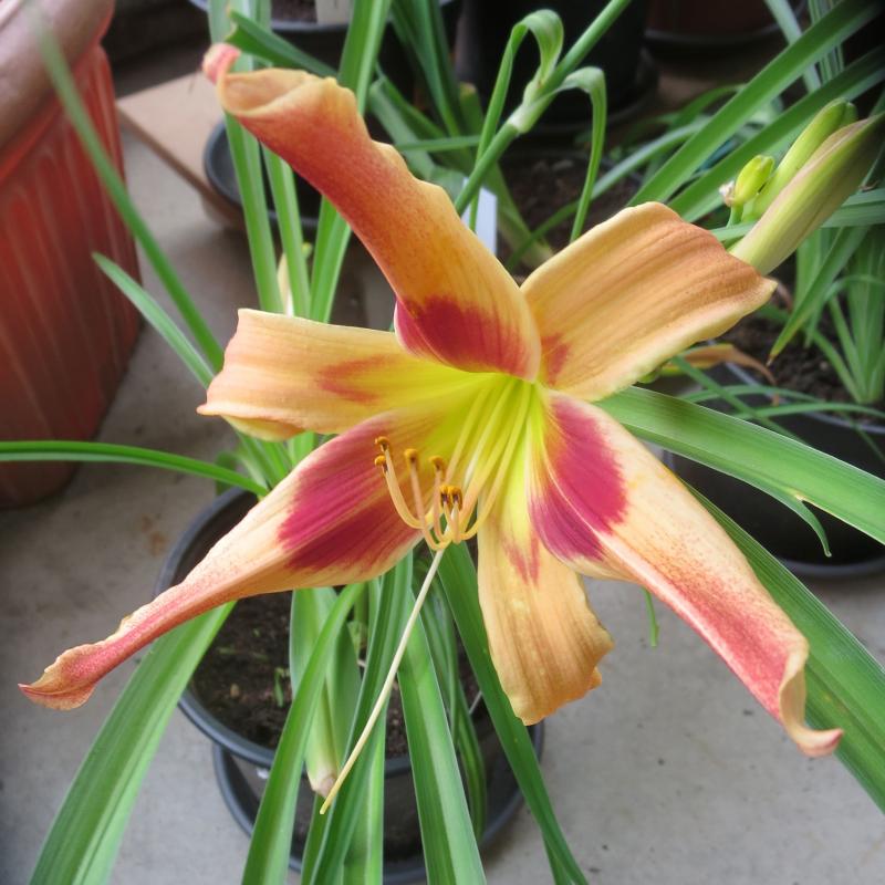 Letzte Blüte eines zwar nicht blauen, aber wunderschönen zartrotäugigen Sämlings aus der Kreuzung Footprints in the Sand x Dragonfly Dawn. Entschuldigt bitte den Regen- und Sturmschmutz und meine Hosenbeine, die sich ständig in meine Fotos drängen.