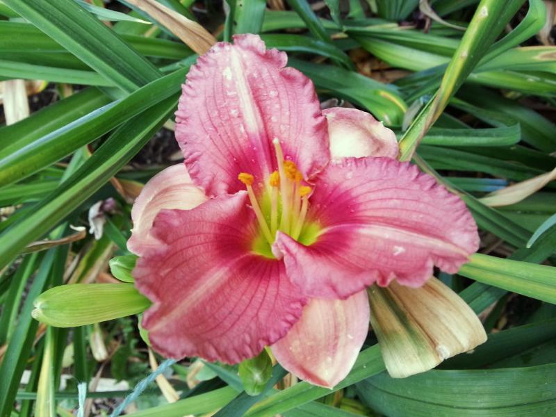 Letzte Blüte eines zwar nicht blauen, aber wunderschönen zartrotäugigen Sämlings aus der Kreuzung Footprints in the Sand x Dragonfly Dawn. Entschuldigt bitte den Regen- und Sturmschmutz und meine Hosenbeine, die sich ständig in meine Fotos drängen.