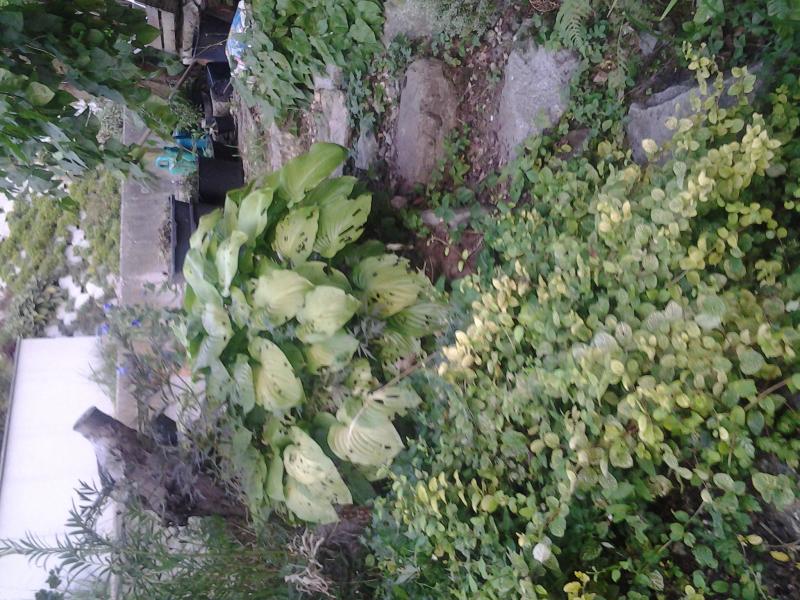 Die Hosta da vorwurden komplett von Schmecken verstümmeltDas Problem war Wurzelfilz vom Flieder. Vor 12 Jahren hatte ich dort 60 cm aufgefüllt, so lang hat das immerhin gehalten.Die andere Seite der Treppe ist nur halbschattig und sieht besser aus