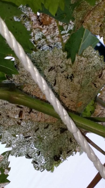 Ich bzw. meine beste Freundin benötigen mal Eure Hilfe:Im Ferienhau in Spanien wird der Wein immer wieder von kleinen dunklen Raupen befallen - zu hunderten! Sie hat bisher immer die befallenen Blätter weggeschnitten und Gift gespritzt (hab leider keine näheren Angaben dazu), 2-3 Wochen war dann Ruhe und dann sind sie schon wiedergekommen. Hab leider nur ein mäßig-gutes Bild. Kann trotzdem jemand helfen?