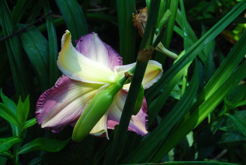 Doch Martina, das bleibt so grün - natürlich verlieren alle Taglilien über den Tag etwas an Farbe und Substanz. Auch hier, denn tatsächlich: Das Beet liegt voll besonnt, südexponiert.Die Hostas "Gold Standard", die hier in ziemlicher Menge dazu gepflanzt sind, kommen damit zurecht. Denn diese Hosta vertragen Sonne.Örtlich bedingte recht hohe Luftfeuchte und lichte Beschattung durch das Taglilienlaub mögen helfen.Überhaupt sind einige Hostas doch noch sehr gut im Sonnenlicht ("normale" Besonnung, keine extremen Situationen).Dies noch zur Ergänzung:Green Arrow und die Standfestigkeit...Pearl hatte zu Jahresbeginn verschiedene Standortüberlegungen ins Spiel gebracht und die Pflanze wurde daraufhn im Frühjahr ein wenig weiter nach vorne gerückt. Auch wenn sich dieser eine Stiel wieder gelegt hat, so stehen doch andere vergleichsweise gut. Stiele sind natürlich nach wie vor dünn. Ich könnte mir aber vorstellen, dass sich die Standfestigkeit nun mit der Zeit noch verbessert.