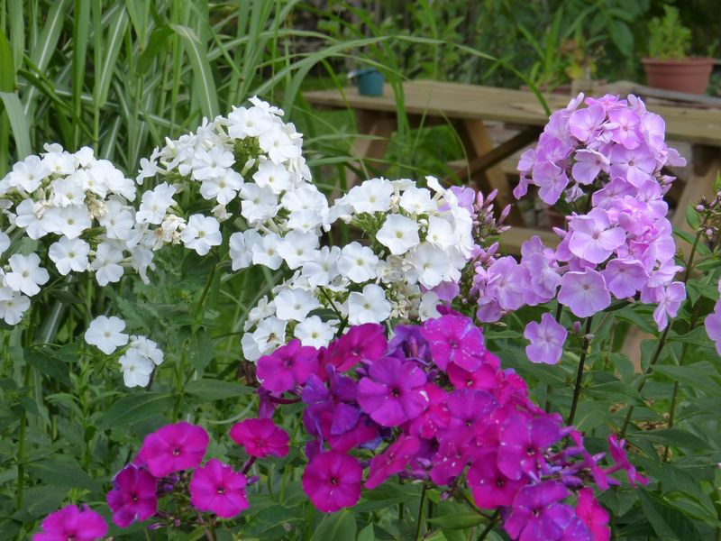 Die immer wieder zu hörende Warnung bei der Vergesellschaftung von 'Wennschondennschon' trifft meiner Meinung nach auch auf andere starkfarbige Phloxe (oder andere Stauden ) zu. Auf dem Beet standen ursprünglich nur 'Uspech' an einem Ende, am anderen WSDS (ich hatte Angst, ich könnte sie nicht auseinanderhalten@Guda, die Kombination gefällt mir! Seit geraumer Zeit habe ich ein paar Ideen für Phloxkombis, vielleicht setze ich einiges davon irgendwann einmal um.