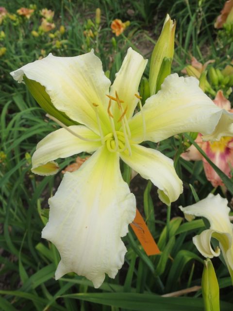 Doch zurück zu den Taglilien.Natürlich konnte ich bei der engen Pflanzung nicht immer zu allen Blüten die Schilder finden, so dass viele Blüten nur schön sind, aber namenlos bleiben müssen.Und es wird sicher auch bei der Auswahl meine Vorliebe für schmalsegmentige Formen, die insgesamt stark in der Minderzahl waren, durchscheinen.Diese namenlose Weiße erinnerte mich sehr an Heavenly Angel Ice, aber ob sie es ist, konnte ich nicht herausbekommen.
