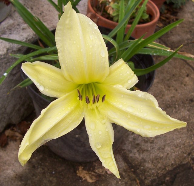 Hier in diesen Faden war ich heuer noch gar nicht. Das liegt daran, daß meine Taglilien verhutzeln, die Trockenheit fordert viel.Trotzdem möchte ich Euch meine Neuzugang zeigen, White Stripe.Sie hat im Topf am Blütenstengel ein panaschiertes Kindel gemacht, der Rest der Pflanze ist grün.