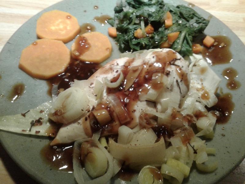 Wieder mal war der dampfkocher im einsatz:Hühnerbrust mit urwaldpfeffer und porree auf Spitzkohl, batatenscheiben, Spinat mit Karotten und dazu eine sojasauce mit viel ingwer und einem schuss sherryPs. Habe heute zum ersten mal voatsiperifery urwaldpfeffer frisch gemörsert zur Hühnerbrust ausprobiert. SUPER!!! Eine deutliche frische citrusnote, dabei von einer erfrischenden, aber nicht (nach-)brennenden Schärfe. Sehr, sehr angenehm