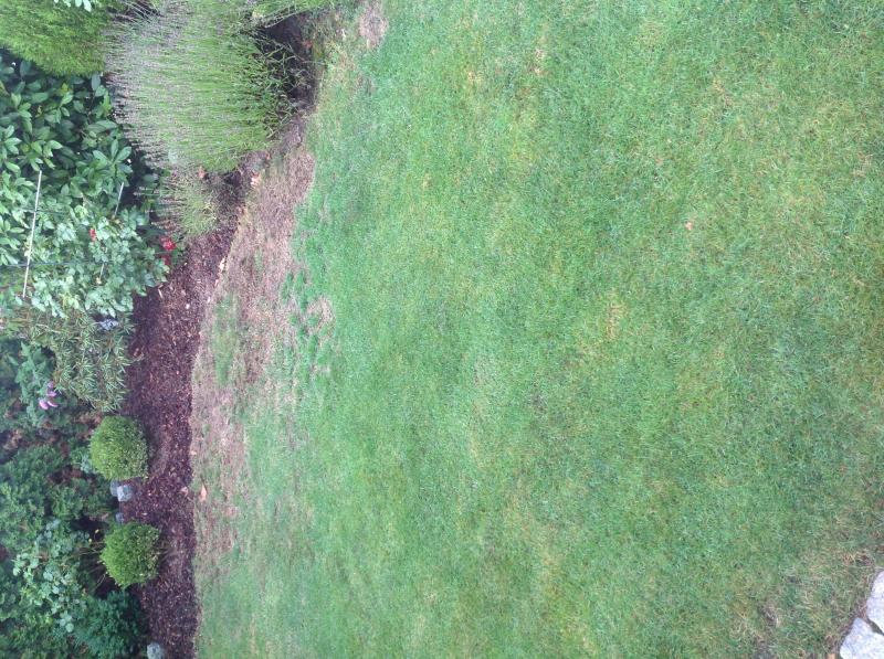 Trockenheit! Vermutlich der Randbereich des Rasensprengers und zusätzlich/oder der Bereich mit etwas weniger Schatten ::)Auf Deinem zweiten Bild sieht man ganz deutlich, dass es vom gepflasterten Bereich ausgeht.... Die Steine speichern Wärme und dadurch ist es trockener. Außerdem ist das Beet eine starke Konkurrenz beim Wasser.Wie gießt Du denn?Irgendwann hab ich mal gelernt, wenn einmal pro Woche so lange gewässert wird, bis der Boden 15 cm tief durchfeuchtet ist, reicht das. (Bei den momentanen Temperaturen von 35-40Grad ist das selbstverständlich etwas zu selten, wenn der Rasen grün bleiben soll.)Dafür braucht es 15 bis 20 Liter Wasser auf den Quadratmeter. Wird dagegen häufiger mit jeweils geringen Mengen gewässert, gewöhnen sich die Gräser daran, das Wasser an der Bodenoberfläche zu finden. Sie bilden keine tief reichenden Wurzeln und werden daher bei Trockenheit viel schneller gelb.Ich habe ebenfalls ein Problem mit absterbendem Rasen. Anbei dazu ein Bild. Der Teil des Rasen ist richtig tod, obwohl gedüngt und bewässert wird. Was könnte das sein?